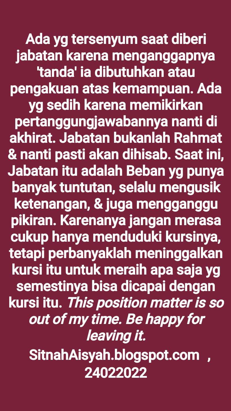 Ada yg tersenyum saat diberi jabatan karena menganggapnya 'tanda' ia dibutuhkan atau pengakuan atas kemampuan. Ada yg sedih karena memikirkan pertanggungjawabannya nanti di akhirat. Jabatan bukanlah Rahmat & nanti pasti akan dihisab. Saat ini, Jabatan itu adalah Beban yg punya banyak tuntutan, selalu mengusik ketenangan, & juga mengganggu pikiran. Karenanya jangan merasa cukup hanya menduduki kursinya, tetapi perbanyaklah meninggalkan kursi itu untuk meraih apa saja yg semestinya bisa dicapai dengan kursi itu. _This position matter is so out of my time. Be happy for leaving it._ SitnahAisyah.blogspot.com, 24022022